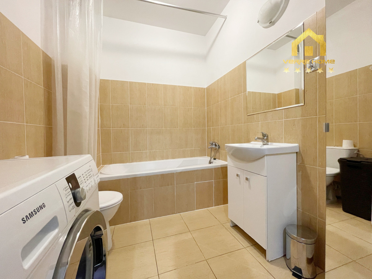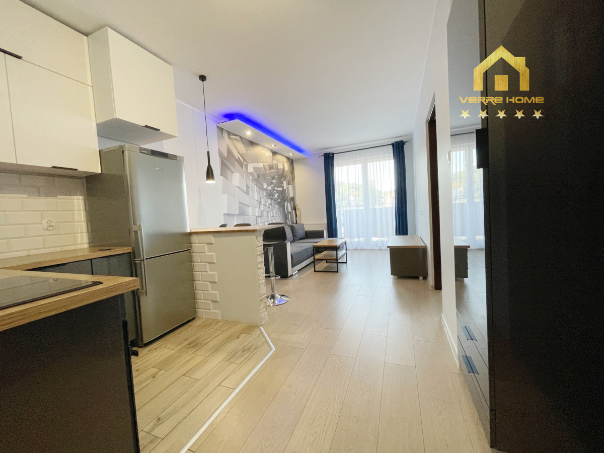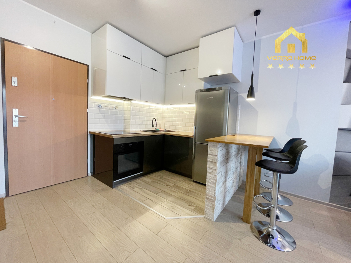 Mieszkanie własnościowe o powierzchni użytkowej 37,30 m2, położone na 1 piętrze. Dojedziemy do niego cichobieżną windą. Mieszkanie składa się z sypialni, salonu z aneksem kuchennym z wyjściem na balkon, łazienki i przedpokoju. W salonie stolik, rozkładana sofa, szafka pod TV, zaś w aneksie kuchennym zabudowa kuchenna wraz z lodówką, piekarnikiem, płytą elektryczną i okapem. Wyspa do spożywania jedzenia, 3 hokery. W sypialni duże łóżko, szafa, komoda, szafki przy łóżku. Na korytarzu szafa w zabudowie. W łazience wanna z funkcją prysznica, pralka, wisząca szafka z umywalką. Na podłodze w salonie i sypialni panele, zaś w aneksie kuchennym, przedpokoju i łazience terakota. Nieruchomość w pełni umeblowana gotowa do zamieszkania. Całe umeblowanie widoczne na zdjęciach.